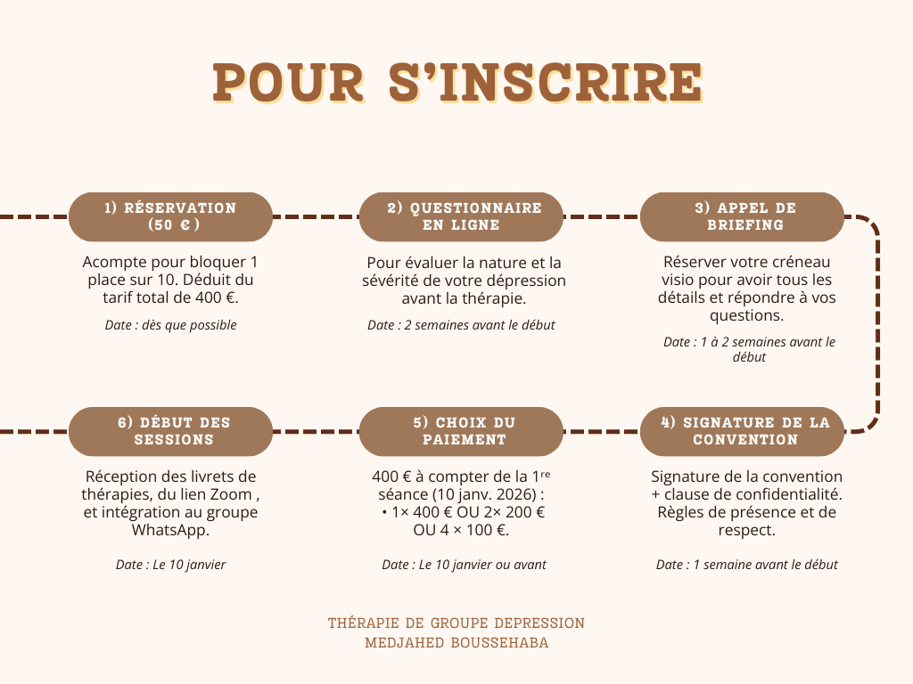 Attention : Ce n’est pas une thérapie de crise, ni un suivi individuel. Si votre situation requiert une intensité plus élevée, je vous oriente vers un dispositif adapté, en lien avec votre médecin/psychologue.